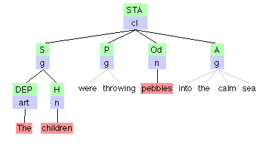 Using an English example, here is a typical tree for the sentence "The children were throwing pebbles into the sea":