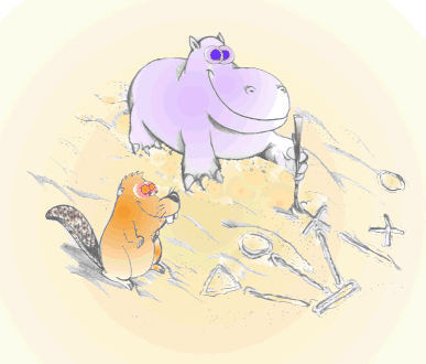 Åen var ikke dyb her, og der lå mange sten i vandet, så bæverungen prøvede at hoppe videre fra sten til sten. Hvis der manglede en sten, stillede Grammy sig i midten med sin brede ryg, så Michael kunne bruge ham som hoppesten. Det var meget skægt og de nåede næsten hjem uden at snyde, dvs. uden at skyde mere en én "flodhestesten" ind mellem de rigtige sten. Dyrene havde fundet ud af, at ord kan danne grupper, ved at ét