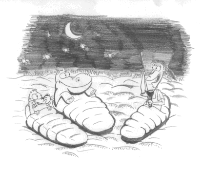 De hentede nogle tæpper fra flodhestefamiliens store ferietelt og fra bæverborgen, og rullede sig sammen på det varme sand, og fortalte endnu et par historier til hinanden. Så faldt de i søvn, mens de små danske myg forsigtig kravlede tilbage én efter én for at se efter, om bålet med sit irriterende røgslør stadigvæk var der.
