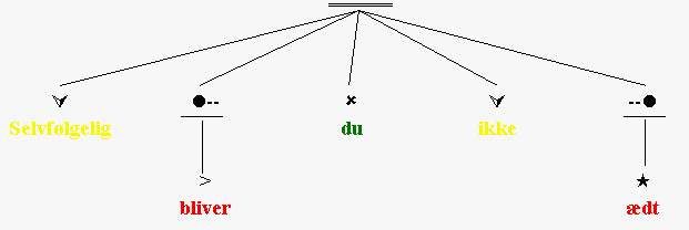 "Det er specielt slemt med verberne," fortsatte bæverfar. "Fordi de egentlig er ret forskellige, selv når de står sammen i verbalgruppen. Fx er der højst ét såkaldt finit verbum, der viser nutid eller datid (som bliver eller blev), og det står altid helt til venstre. Og det vigtigste verbum, sådan rent betydningsmæssigt, står altid helt til højre, hvis der er flere verber i gruppen. Det verbum kaldes så for hovedverbum (), og de andre - til venstre - hedder hjælpeverber (). Hovedverbet er det ord der kan erstatte hele verbalgruppen. Når verbalgruppen splittes op i to diskontinuerlige led, fx af subjektet eller det lille adverbial ikke, er det gerne det første - finitte - hjælpeverbum ('), der fraspaltes. Fx:"