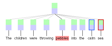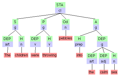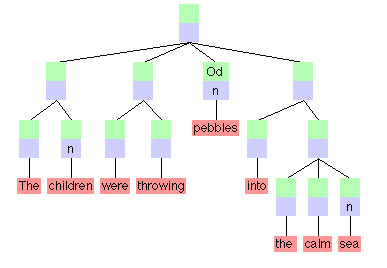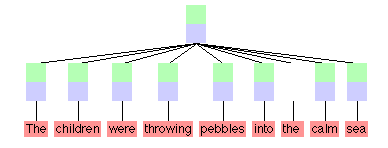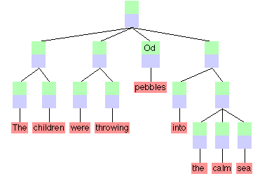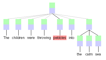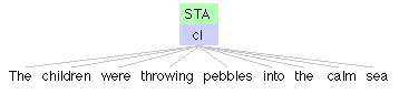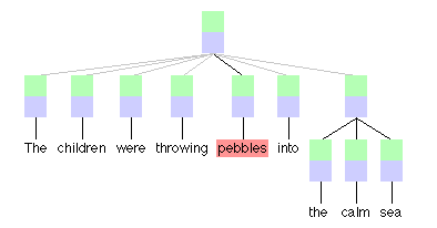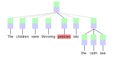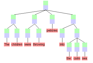 Using an English example, here is a typical tree for the sentence "The children were throwing pebbles into the sea":