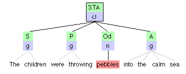 Any node in the tree can be labelled with the relevant form and/or function symbol by a) first clicking on the relevant symbol in the top form and function bars, and b) then clicking on the relevant node. For example, you can identify "pebbles" as the direct object by clicking on "Od" in the green function bar and then clicking on the node above "children" (it does not matter where in the node you click). The result will be: