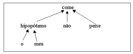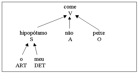In the example, hipopótamo has not only been identified as head of o and meu and as dependent of come, but also as subject (S), while its dependents have been classified as article-modifier (ART) and determiner-modifier (DET), respectively. 1.4.2. Constraint Grammar Constraint Grammar uses a flat dependency notation in combination with function labels, thus integrating the classical system of word based function. Directed open dependency markers (> = head to the right, < = head to the left) are attached to individual words, and combined with function symbols: 1.4.3. Enriched Constituent Grammar Dependency grammar's different concept of syntactic form can be integrated into the constituent grammar notation, yielding a minimum of function: