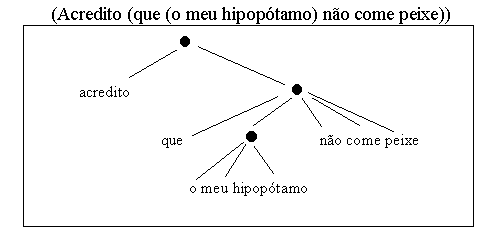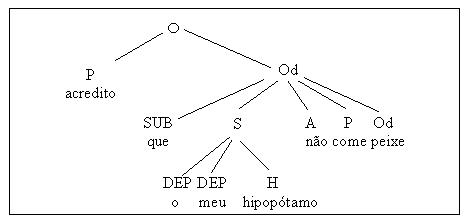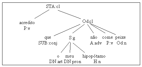 In Constraint Grammar's flat dependency notation, the same tree can be expressed as in-text information without bracketing, with group information subscripted at the group's head, and subclause information superscripted at the clause's first verb or complementizer: AcreditoMV:v queSUB:conj<ACC:fcl o>N:art meu>N:det hipopótamoSUBJ>:n nãoADVL>:adv comeMV:v peixe. |