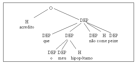 Dependency Grammar does not use word-less nodes or zero (empty) constituents, and its strictly word-based analysis has the pedagogical advantage of not having to "see" larger units before constituent relations can be established. Rather, constituents grow larger as the analysis progresses. Thus, it doesn't matter whether meu is attached to hipopótamo before or after hipopótamo is attached to come. In dependency grammar, syntactic function is expressed indirectly as the asymmetrical relation between heads and dependents. Pure Constituent Grammar: Hierarchical word grouping (syntactic form), no function (Acredito (que (o meu hipopótamo) não come peixe))