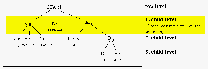 PORTUGUESE SYNTAX 2. Building trees: The notion of constituent At a given level of analysis, we define as constituents of a syntactic unit those words or groups of words that function as immediate "children" of this syntactic unit. Every syntactic unit must itself be a constituent, the highest node being the sentence. In the sentence O governo Cardoso crescia com a crise, none of the nouns is a direct constituent ("child node") of the sentence. governo is part of a noun phrase (np), which IS a constituent (subject) of the sentence, while crise is placed even lower in the tree, being part of a noun phrase (np), which is part of a prepositional phrase (pp), which IS a constituent (adverbial) of the sentence.