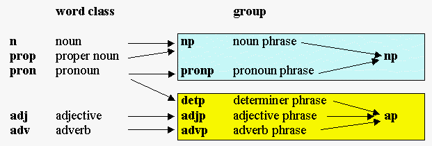 With regard to form, constituents can be either single words (crescia), or groups (o governo Cardoso, com a crise) and clauses (que hipopótamo não come peixe), both of which are complex units. With regard to dependency relation, constituents can be heads (H) or dependents (D), which is also the minimal functional distinction, often used for in-group constituents - where the number of different functions is very restricted, and predetermined by the type of group in question. Word constituents are form-classified according to their morphosyntactic word class. Groups are classified according to their prototypical head material, i.e. noun phrase (np), prepositional phrase (pp), adverb phrase (advp) etc. The same holds for clauses, where the leading verb is regarded as head, if there is one, - yielding the categories finite (fcl) and non-finite clauses (icl). Clauses without verbs will here be called averbal clauses (acl). Averbal clauses are headed by a subordinator. In this book, we will be using the following word classes and group types: