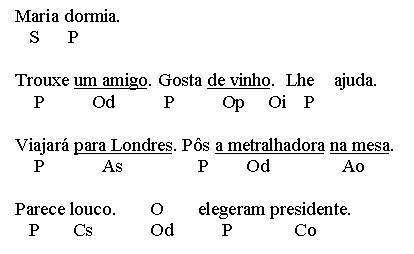 PORTUGUESE SYNTAX 3. Clause level functions Clause level arguments (valency governed) The functional pivot of most clauses is a verbal constituent (V), also called predicator (P). Complex verb chains can consist of both main verbs (MV) and auxiliaries (AUX), linked by a dependency relation, and possibly by an auxiliary subordinator (SUBaux). For the sake of simplicity, we will here stick to single verbs, and treat complex predicators in another chapter. In Portuguese, there are four main types of clause level arguments, the subject (S), objects (O), argument adverbials (A) and complements (C). Objects are subclassified according to pronominal case, argument adverbials and complements as to whether they relate to the subject or - if present - to the direct object. In the examples, complex constituents are "united" by underlines.