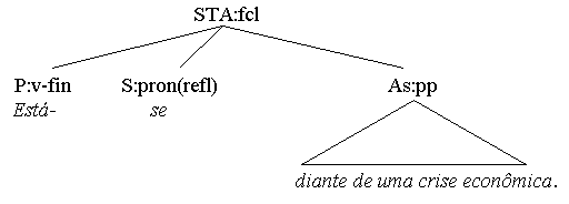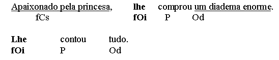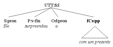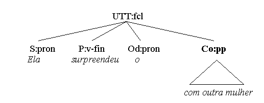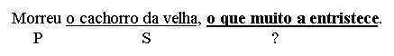Here, the subclause complementizer (the pronoun o que) is relative not to a noun or np, but to a whole statement, yielding a kind of anaphor effect. In fact, one could split the sentence in two and rewrite it in the following way: Tristemente para ela, morreu o cachorro da velha. Finally, we will describe also vocatives as clause level predicative adjuncts, called vocative adjuncts (fCvoc): Salve-me, meu Deus! Desliga, amor,