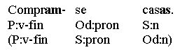 The different types of arguments in the examples can be distinguished by pronominal substitution: S (subject) demands nominative case when pronominalized (eu, tu). The subject has person and number agreement with its clause's finite verb (or, possibly, leading infinitive). Oacc (direct or accusative object) demands accusative case when pronominalized (o, a, os, as): "Trouxe-o". Both S and Oacc can be pronominalized with "o_que". Opiv (prepositional object) is always a pp [prepositional phrase] and demands prepositional case (also called oblique or prepositive: mim, ti) when the argument of its preposition is substituted by a pronoun: "Gosta de ti." Adverbials can be pp's, too, but prepositional objects can be distinguished from argument adverbials (or adverbial objects, A) by the fact that they can't be replaced by adverbs, and from adjunct adverbials by the fact that they are valency bound (cp chapter 3.2). Odat (pronominal dative object) is the function assigned to the pronominal form 'lhe'. Dative objects typically occur as optional number 2 object in the presence of a number 1 direct object (Oacc): "Lhe (Odat) dá um presente (Oacc)." Lhe alternates with pp-objects introduced by the prepositions 'a' or 'para', which is why such pp's could be regarded as dative objects, too: "Dá um presente a ela (Odat)." The corresponding non-pronominalized construction is, however, (form wise!) indistinguishable from a prepositional object, and will here, for the sake of formal consistency, be tagged as such: "Lhe ajuda" (Odat) - "Ajuda a ele" (Opiv). C (complements or predicatives) can be substituted by either "tal" or "isto", but normally not by personal pronouns: "Parece tal" (Cs) , "O elegeram isto" (Co) . Complements differ from objects in complementing both the clause's main verb and its subject (Cs) or direct object (Co). That's why they are called predicatives - like adnominal modifiers, they predicate something of a noun, while the clause's main verb is reduced to a kind of connecting device (called copula for the Cs-predicative) without much semantic content of its own. For focusing, Cs can be fronted, while Co can't (rico [Cs] não é - *engraçado [Co] não o acho). Adjectives and participles with predicative function have number and gender agreement with their nominal referent, Cs with the subject, Co with the object. A (argument adverbials or adverbial objects) can be substituted by an adverbial pronoun: "Viajará lá." (As), "Pôs a metralhadora lá." (Ao). Like complements (C), some argument adverbials (A) can be distinguished with regard to subject or object connection (As and Ao). Place and direction adverbials, in particular, "feel" very "predicative": "Mora lá" (As or Cs?), "Colocou-o lá" (Ao or Co?), and the same is true of "Está bem" (As or Cs?). Still, in all three cases we will folow the adverb substitution test and settle for the adverbial function tag (A). A very special case are the measuring verbs durar [7 horas], custar [7 coroas] and pesar [7 gramas]. Superficially, the arguments of these verbs seem to ask for direct object function (Oacc), but both the accusative pronoun substitution test and the "o_que"-substitution test fail. Only substitution with "quanto"/"tanto" works, and in the framework of this grammar, we will opt for an A analysis (argument adverbial), adding "quanto" - at least where it doesn't alternate with "o_que" - to the short test list of adverbial interrogative pronouns ("onde", "quando", "como"). Each Portuguese verb has a fixed set of valency patterns. The examples given concern "maximal valency", including both obligatory and optional complements: