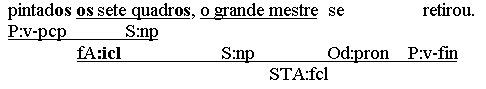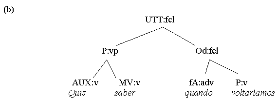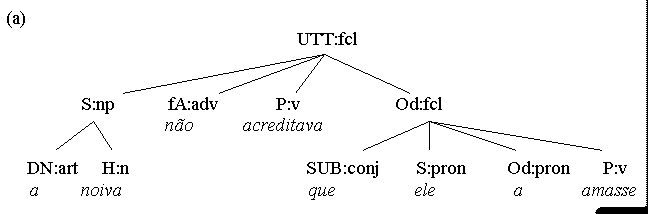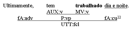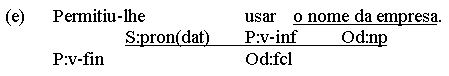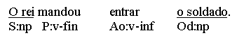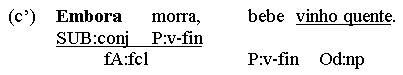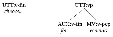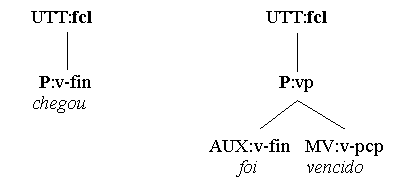 (a) Chegou. (b) Chove. (c) Começamos! (d) Coma! (e) Foi vencido. Utterances like the above fit the form categories of either word (a-d) or group (e). However, since all 5 utterances are predications and feature predicators, it is tempting to also classify them as clauses. This, however, is in conflict with the first condition in our definition of a clause as (1) a multi-constituent nexus (2) featuring a predicator and/or a subordinator. The problem gets even worse if one reads enclitic or mesoclitic pronouns not as individual words, but as morphological parts of the verb. One solution is to make a distinction between the concepts of sentence and clause. A sentence, defined simply as the top node of any syntactic analysis, does allow v-only or vp-only predications, while a clause, with its multi-constituent condition, does not. Thus, the 5 predications above are sentences, but not clauses. In the system advocated here, hyphenated enclitics will be regarded as syntactic constituents with their own branch in the syntactic tree, and in v-only or vp-only utterances the form-tag of clause (fcl) and the function tag of predicator (P) may be used optionally, creating an additional (non-branching!) node in the analysis: