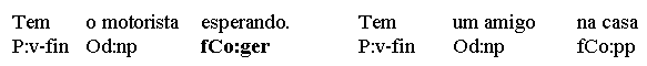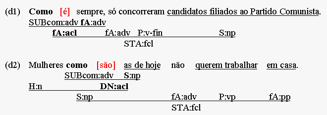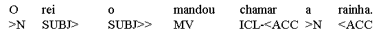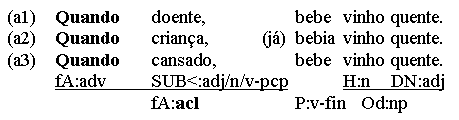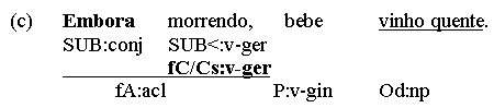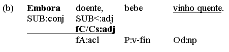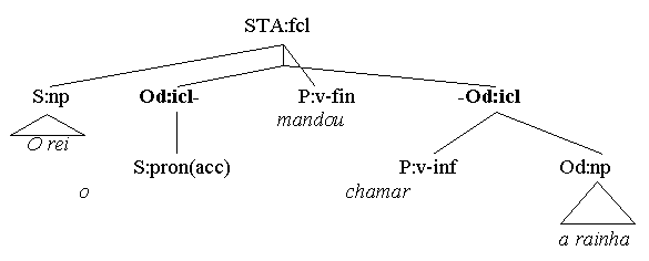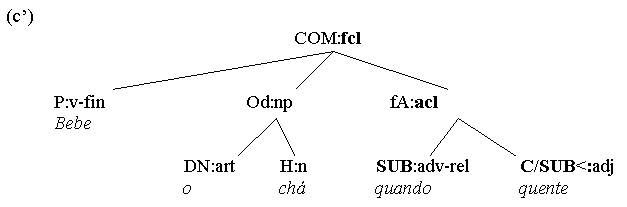 Now, predicating nexus-relations can be found in other than subject-predicator structures, too. Object predicatives (object complements, Co) or argument adverbials, for instance, can predicate something of a direct object (Oacc), not the subject - introducing a secondary nexus into the same clause, making double use of the clause's predicator. (a) Pôs a arma no chão. (Oacc - Ao) (b) Chamou o projeto uma desgraça. (Oacc - Co) (c) Bebe o chá quente! (Oacc - fCo) Sometimes, however, predications are subordinated by a complementizer (clause header) - and thus, isolated from the parent clause's predicator - without providing an additional predicator. Here the concerning predication is a nexus between explicit and implicitly anaphoric material (the latter expressed in the parent clause), linked not by a predicator but by a subordinator. Thus, (c) can be turned into a 2-clause construction by adding a subordinator: