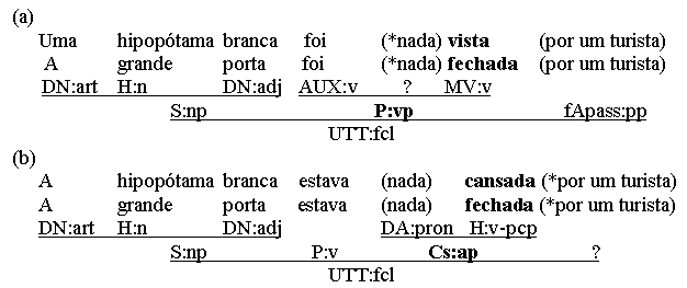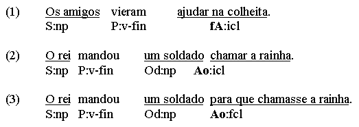 PORTUGUESE SYNTAX 7. Clause types Ordinary clauses could be regarded as a kind of group - big "verb phrases" , with a verbal head governing clause level arguments and adjuncts, but here we will treat the term vp as the form category of complex predicators (i.e. verb chains with auxiliaries, cp. chapter 5). Verb/predicator-containing clauses can be subdivided into finite (fcl) and non-finite (icl) clauses. In an fcl, the main verb (or the first auxiliary in a vp verb chain) is finite (i.e. tense-inflected), in an icl it is not. Non-finite clauses can be infinitive clauses, gerund clauses and participle clauses. Clauses that are constituents of a larger syntactic unit (typically another clause or a pp), are called subclauses. In Portuguese, all finite subclauses are introduced and subordinated by a so-called complementizer (a conjunction, relative or interrogative), while non-finite subclauses usually are not. Semantically, clauses can be described as predications, where something (the predicate) is predicated of something else (the subject) . In syntactic terms, the relation between subject and predicate is called a nexus. In ordinary Portuguese clauses, the nexus-link between predicate and subject is mediated by a (verbal) predicator. Predicators are part of what is predicated, contributing between next to no content (copula verbs linking predicatives, e.g. ser, estar) or all of the content (intransitive verbs, e.g. trabalhar, dormir). In the examples, subjects are in italics, predicates are underlined and predicators are in bold face: Ele era um herói nacional. (content-less copula predicating Cs predicative) A criança dormia. (intransitive verb, predicate